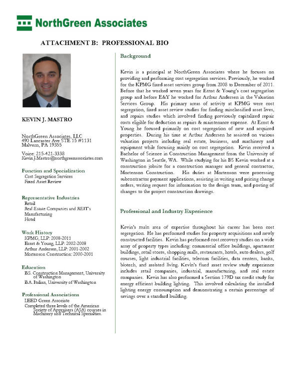 Kevin is a principal at NorthGreen Associates where he focuses on providing and performing cost segregation services. Kevin has over 10 years of experience in the field of cost segregation. Previously, he worked for the KPMG fixed asset services group from 2008 to December of 2011. Before that he worked seven years for Ernst & Young’s cost segregation group and before E&Y he worked for Arthur Andersen in the Valuation Services Group. His primary areas of activity at KPMG were cost segregation, fixed asset review studies for finding misclassified asset lives, and repairs studies which involved finding previously capitalized repair costs eligible for deduction as repairs & maintenance expense. At Ernst & Young he focused primarily on cost segregation of new and acquired properties. During his time at Arthur Andersen he assisted on various valuation projects including real estate, business, and machinery and equipment while focusing mainly on cost segregation. |